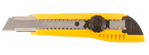 «Отламывающиеся лезвие», с вращающимся пластиковым прижимом из высокоуглеродистой стали. Материал: пластиковый корпус, усиленный металлической направляющей, лезвие из инструментальной стали. Упаковка: п/э пакет с картонным подвесом.